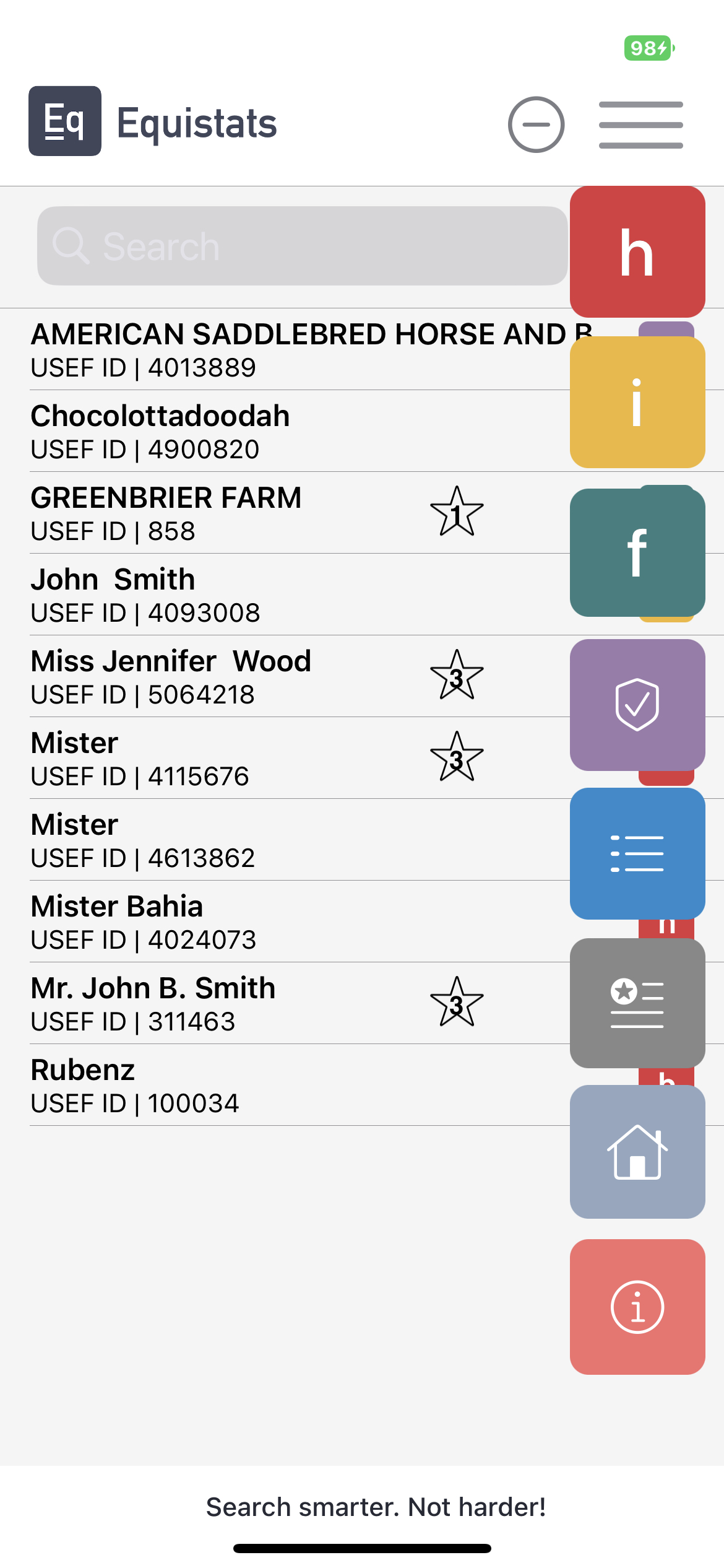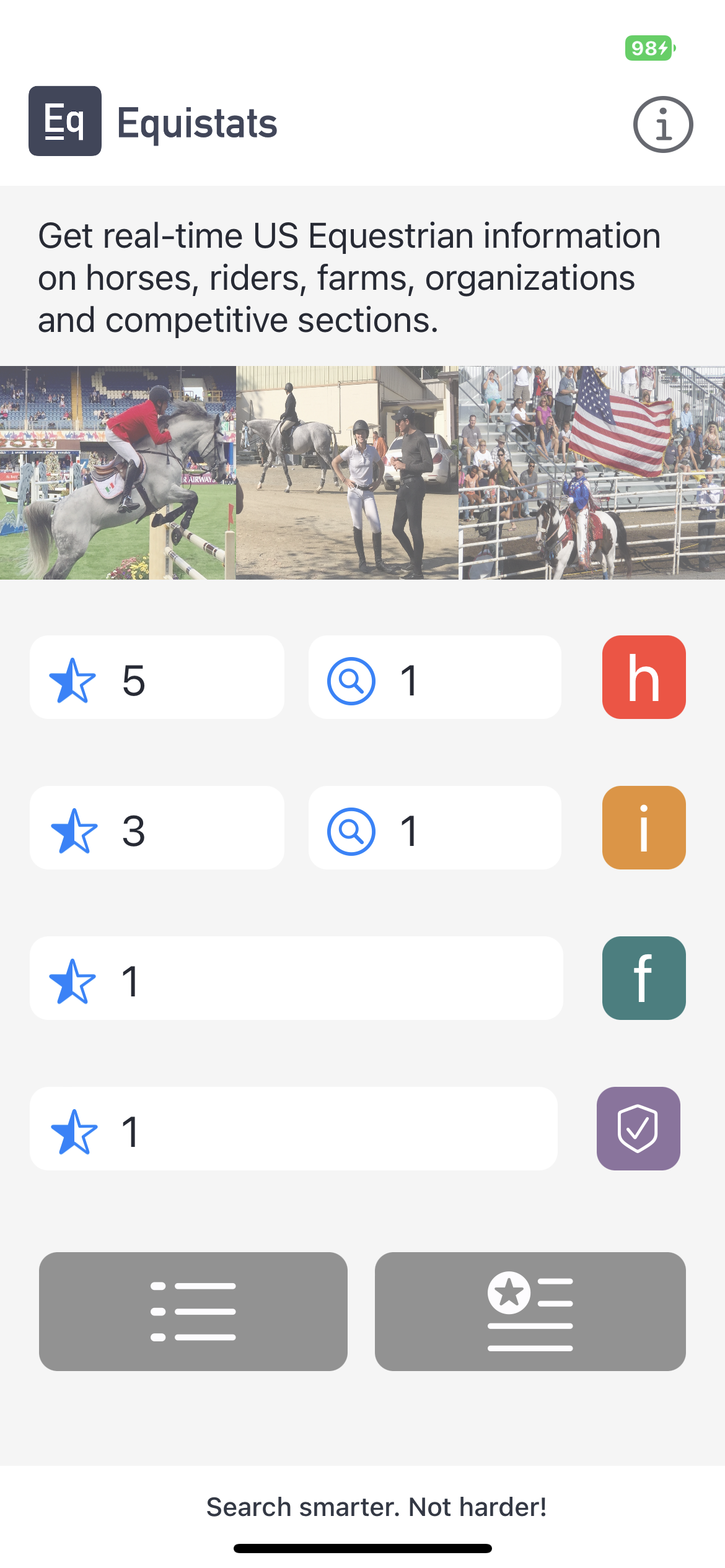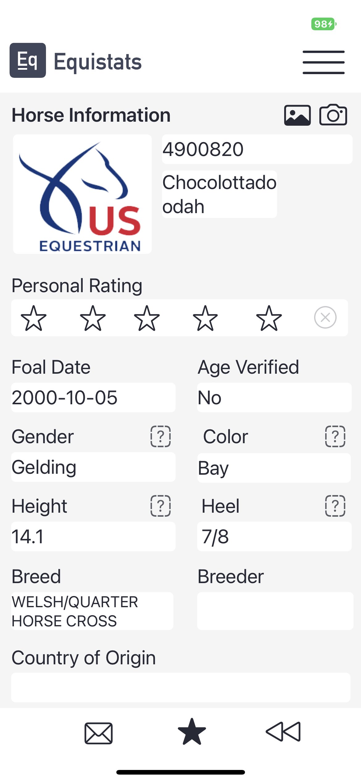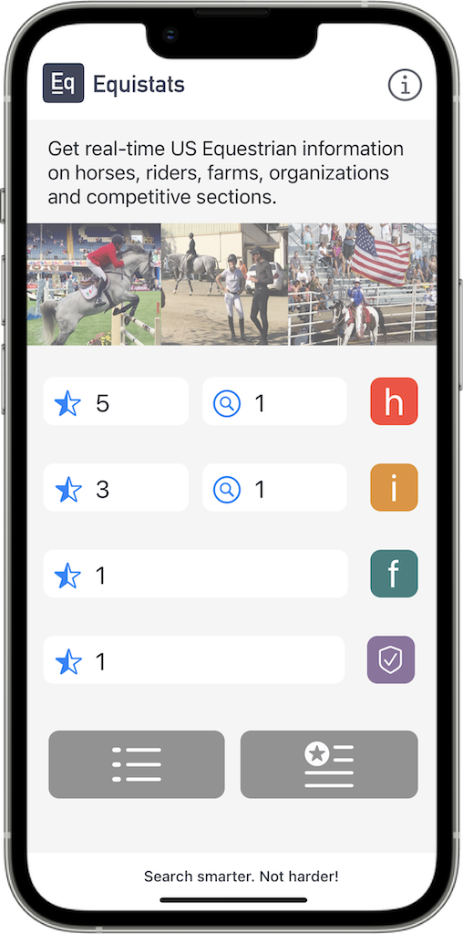 Easily keep track of your favorite horses, riders or organizations. You can add a photo and personally rate them. Create your own metrics. You be the judge.